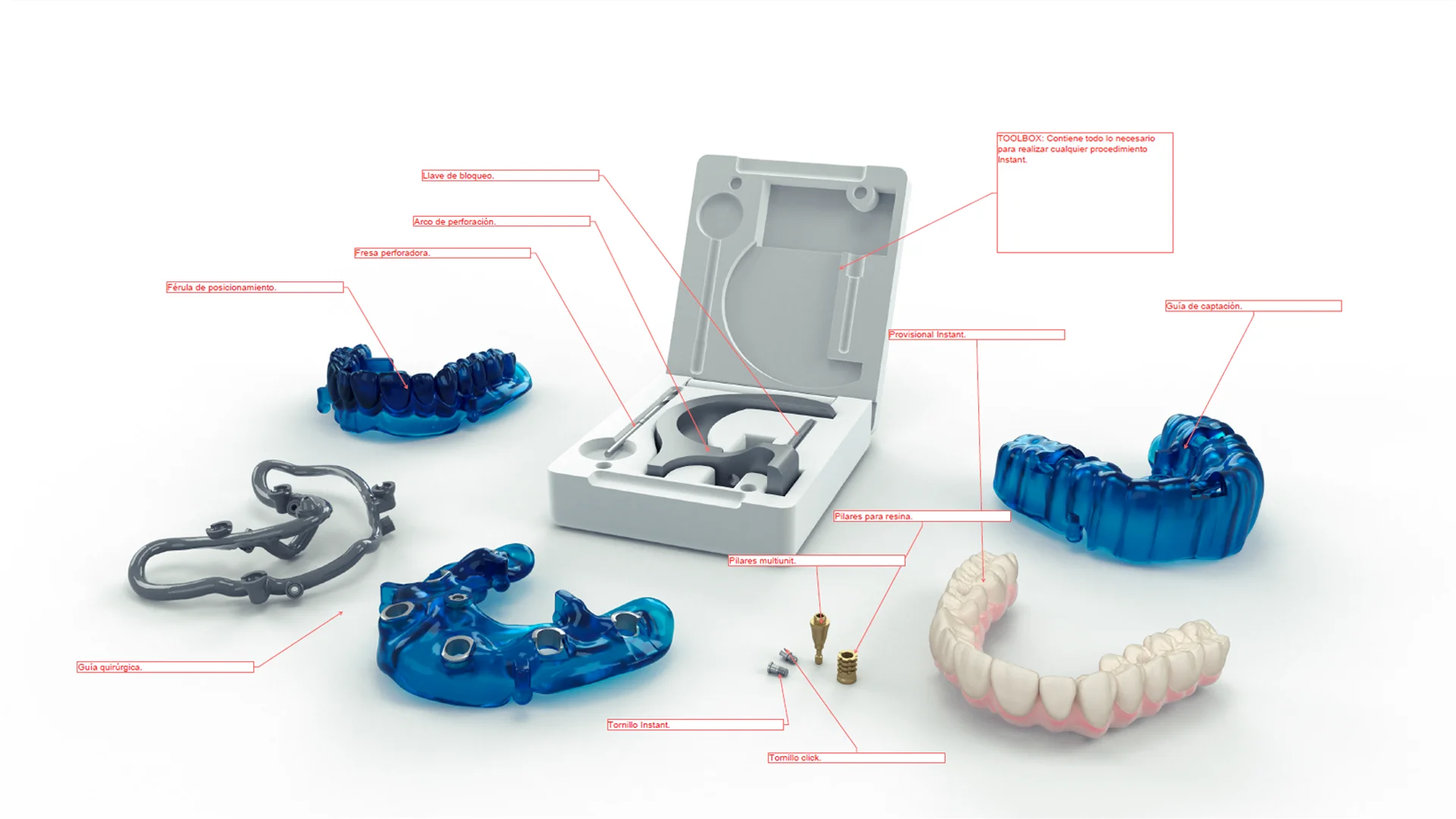 Each Instant® case is delivered in a complete box containing all the elements required for treatment: provisional teeth, positioning guides, surgical guide, transepithelial abutments, resin abutments, and screws.