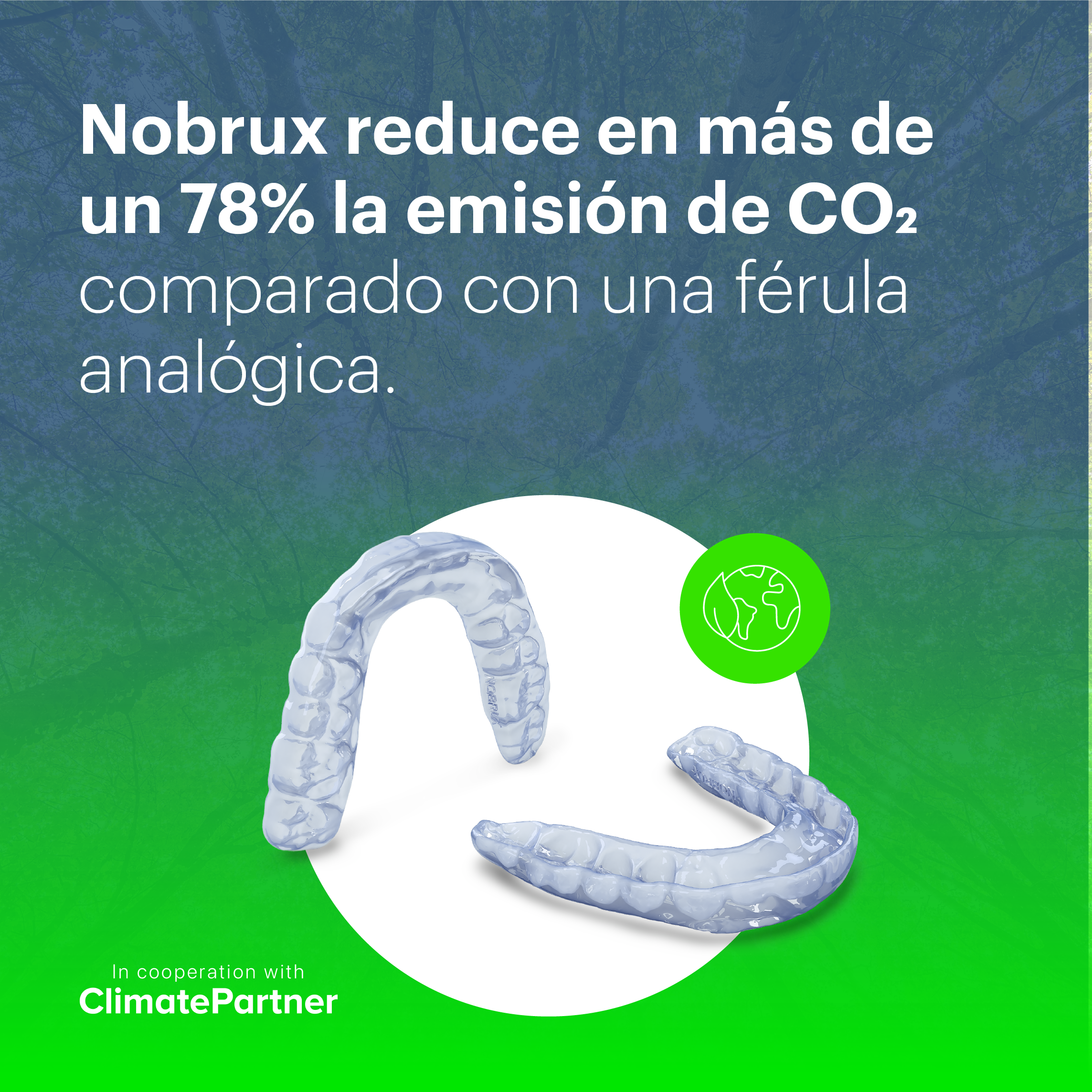 Nobrux, la férula de descarga anti bruxismo de Corus, te ayuda a reducir tu huella de carbono hasta en un 78% frente a una férula analógica convencional.