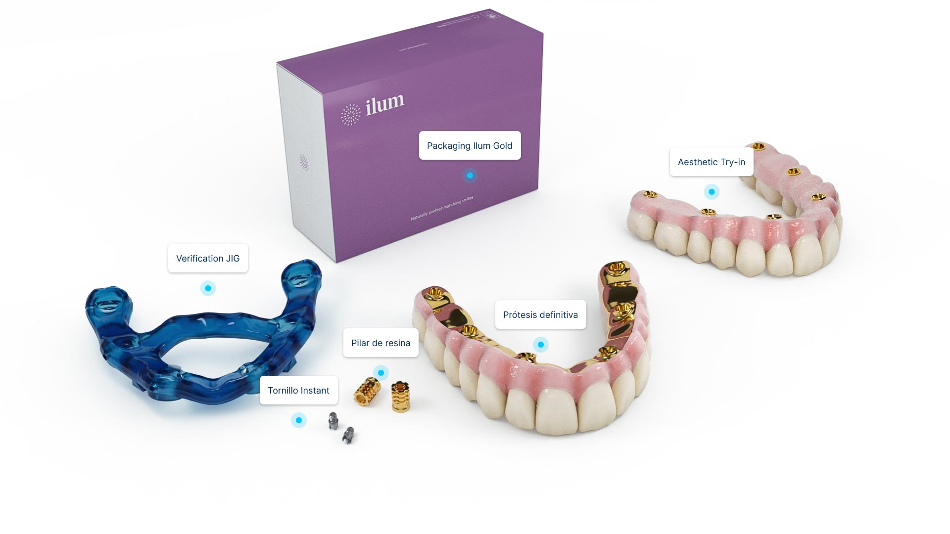 Ilum Gold, a zircónia monolítica sobre implantes é ideal para grandes restaurações. Incorpora uma interface personalizada concebida com a máxima precisão e ajustada aos parâmetros biomecânicos ideais, para fazer do conjunto a solução mais precisa, estável e estética.